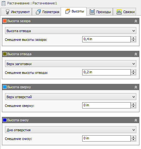Параметр "Высота отвода" позволяет задать высоту, на которую поднимается инструмент перед следующим шагом резки. Значение высоты отвода должно быть выше значений параметров Высота подачи и Высота сверху. Параметр "Высота отвода" используется вместе с последующим смещением для задания высоты.