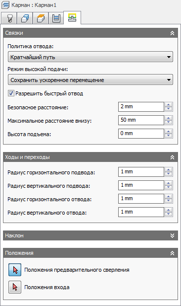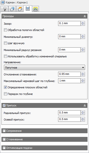 Данный параметр позволяет создать постоянную спиральную траекторию перемещения инструмента для кармана. Таким образом обеспечивается плавная работа на станке.