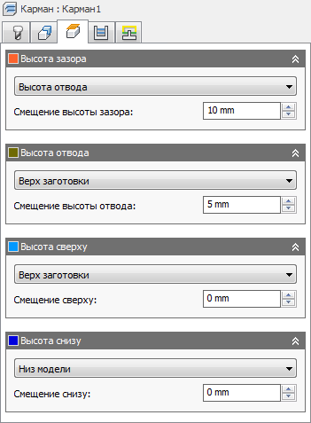 Параметр "Высота сверху" позволяет задать высоту, определяющую верхнюю точку выреза. Значение высоты сверху должно быть выше значения параметра Высота снизу. Параметр "Высота сверху" используется вместе с последующим смещением для задания высоты.