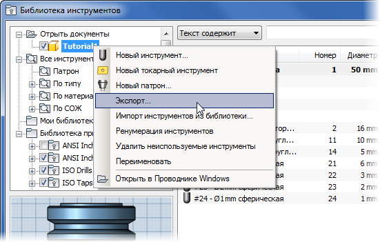 Autodesk HSM позволяет экспортировать таблицы инструментов из открытых документов в обычные библиотеки инструментов. Это может быть очень полезно, если выполнена настройка таблицы инструментов в виде документа для станка и требуется повторно использовать ее в других документах.
