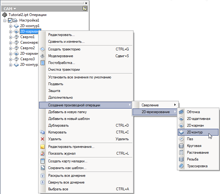 Если, например, требуется выполнить какой-либо метод параллельно с методом контурной обработки и использовать большую часть аналогичных параметров (припуск, допуск, шаг фрезеровки, границы и т. д.), проще использовать производную операцию, а не создавать новую.