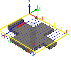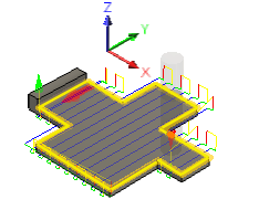 В этом примере в качестве контура выбрано одно ребро (синяя линия рядом с красной стрелкой) и определены дополнительные черновые проходы. Параметр «Контуры заготовки» позволяет удлинить траекторию перемещения инструмента, чтобы освободить ребра выбранной области заготовки. Он также позволяет ограничить количество черновых проходов внутри этой области.