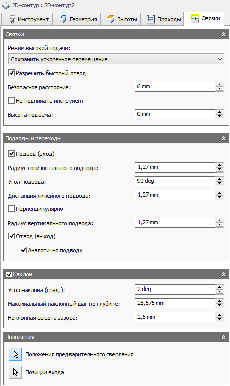Указание максимального шага понижения на оборот профиля уклона. Этот параметр позволяет ограничить нагрузку на инструмент при выполнении вырезов в полную ширину в процессе создания уклона.