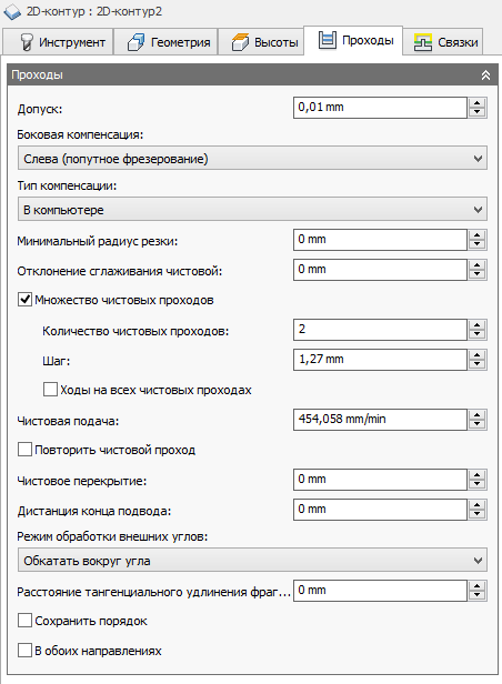 Максимальная степень сглаживания, примененная к проходам чистовой обработки. Используйте этот параметр, чтобы избежать острых углов на траектории перемещения инструмента. При задании этого параметра в углах контура остается больше материала, чем требуется.