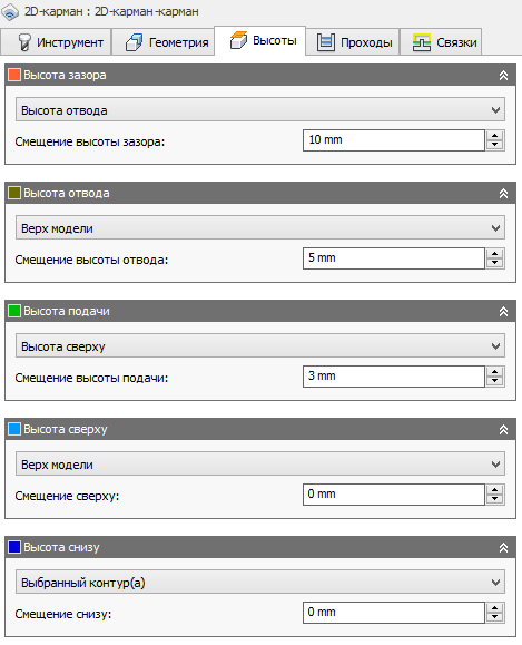 Параметр Смещение высоты подачи применяется к значению параметра "Высота подачи", выбранному в приведенном выше раскрывающемся списке, и отсчитывается относительно его значения.