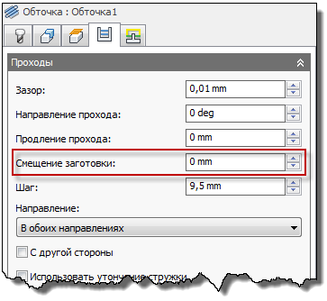 Параметр Смещение заготовки на вкладке Проходы