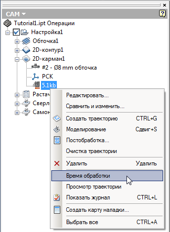 Отображение параметра Время обработки для выбранной траектории перемещения инструмента