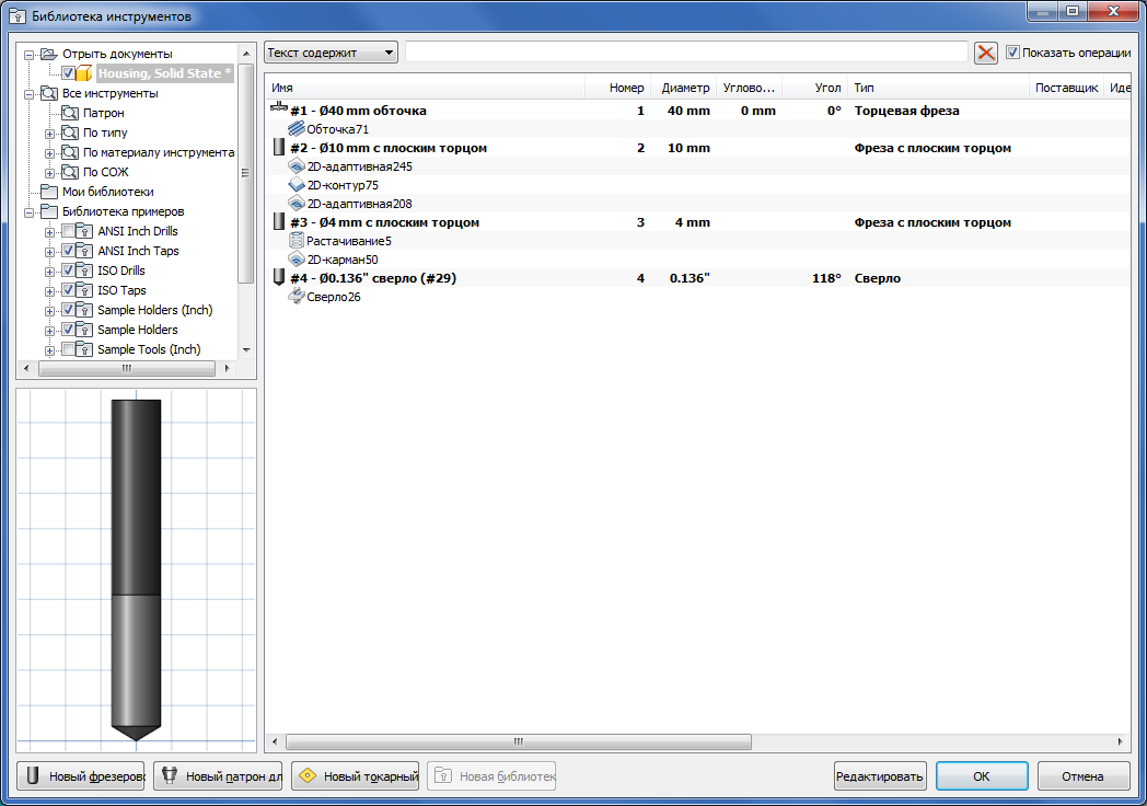При работе над заданием обычно можно определить несколько инструментов и проверить их в целях получения нужного результата для выбранной операции. После завершения всех операций для обработки детали в Библиотеке инструментов для текущего документа можно обнаружить инструменты, не назначенные ни одной операции (неиспользуемые инструменты).