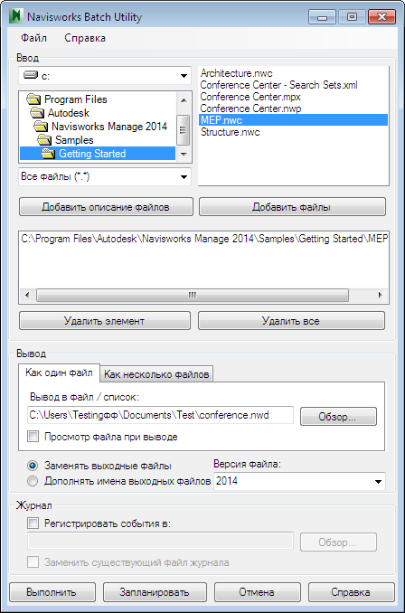 - В диалоговом окне Autodesk Navisworks используйте область "Ввод" для создания списка проектных файлов, которые следует преобразовать.