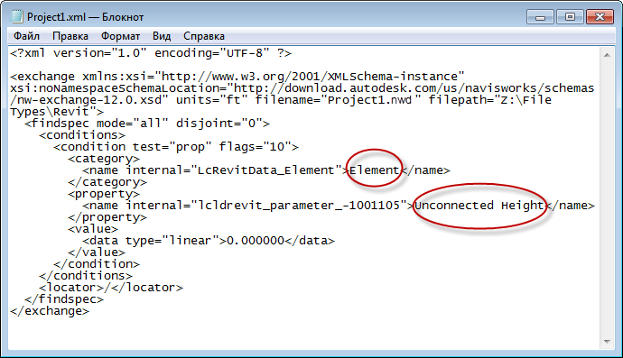 Обратите внимание, что на рисунке выше категория "Элемент" в окне поиска элементов (слева) отображается как вкладка "Элемент" в окне "Свойства" (справа), а свойство модели "Неприсоединенная высота" отображается в каждом окне в столбце "Свойство". Затем можно экспортировать содержимое окна поиска элементов в файл XML, как показано на рисунке ниже. Обратите внимание на то, как закодированы сегменты "Элемент" и "Неприсоединенная высота":