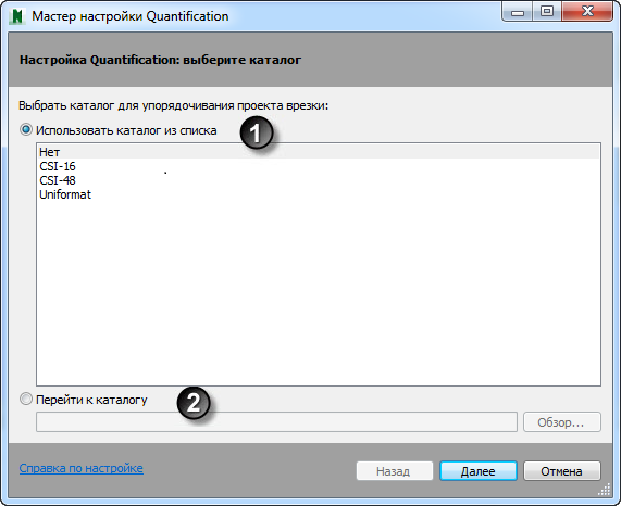 2. Переход в каталог: установите флажок и нажмите кнопку "Обзор", чтобы перейти в нестандартный каталог. Каталоги должны быть представлены в формате XML и обязательно иметь те же единицы измерения и свойства, которые содержатся в текущем файле проекта.