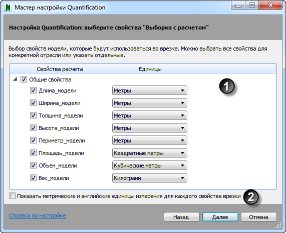 1. Свойство "Выборка". Для каждого свойства выберите единицы измерения из раскрывающегося списка.