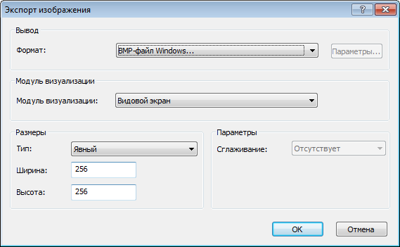 - В областях "Размер" и "Параметры" задайте размер изображения. См. раздел Диалоговое окно "Экспорт изображения".