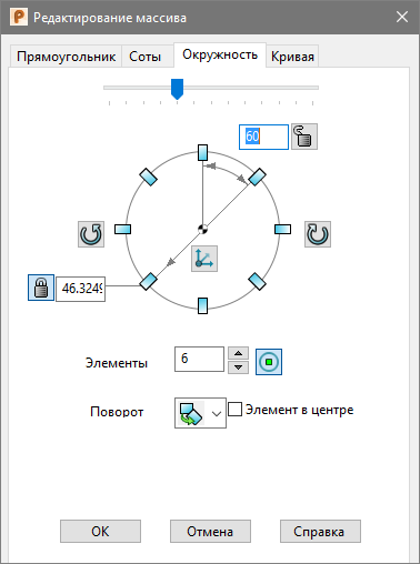 Задать радиус массива - введите нужный радиус расположения элементов вокруг центра массива и нажмите клавишу Enter или Tab. Массив корректируется в соответствии с введенным значением. Эта опция доступна, только когда отображается