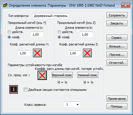 Нажатие на кнопку Больше. В дополнительном диалоговом окне появляется возможность для определения остальных параметров типа элемента, определенных по нормах, таких как: тип нагрузки, параметры сечения, изменения влажности и т. д.