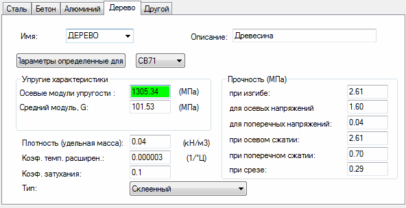 - Осевой модуль упругости - значение модуля Юнга для выбранного типа деревесины.