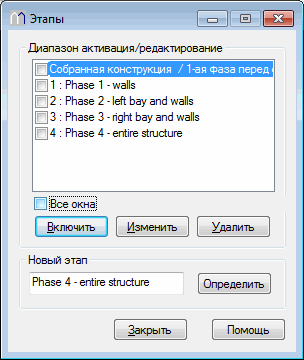 - определить этап конструкции в диалоговом окне, приведенном ниже; этап будет введен в поле Активизация/диапазон редактирования;