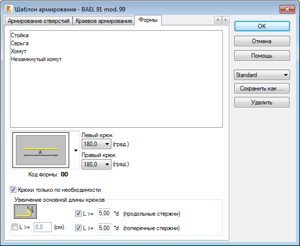 Вкладка "Формы" позволяет придать форму элементам поперечной и продольной арматуры.