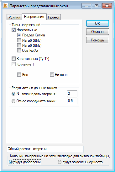 Пользователь может выбрать параметры для представления в таблице и на диаграмме. Щелчок правой кнопкой мыши в поле диаграммы активизирует контекстное меню, содержащее опцию Колонки таблицы. Пользователь имеет возможность выбрать в данном диалоговом окне параметры для представления для общего расчета стержней конструкции. Данное диалоговое окно содержит следующие вкладки: "Силы", "Напряжения" и "Проект".