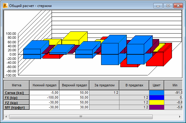 - Столбец 2 – значение верхнего предела. Эта величина определяет максимальное значение выбранного параметра и определяет стержень для которого превышено максимальное значение;