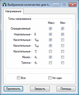 На вкладке "Анализ напряжений. Конструкция" представлены значения напряжений в выбранных стержнях конструкции. Типы напряжений, представленные на вкладке, выбираются в показанном ниже диалоговом окне, которое появляется на экране, как только в контекстном меню правой кнопкой мыши будет выбрана опция "Столбцы таблицы".