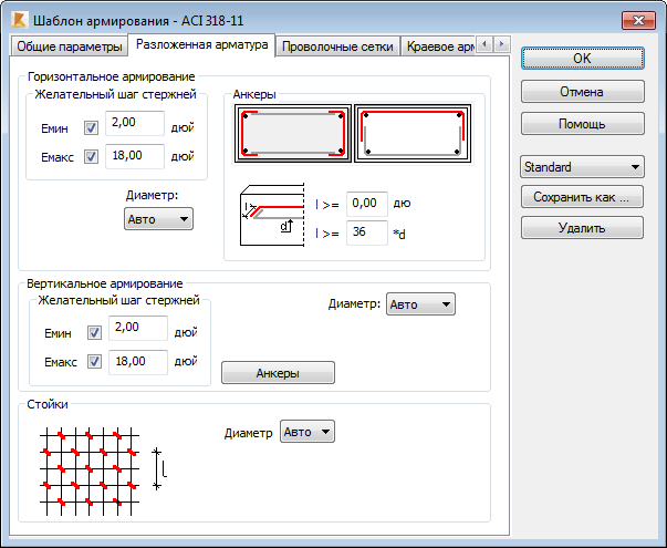 Желательный шаг стержней (максимальный и минимальный): определяет предпочтительный шаг вертикальных стержней.