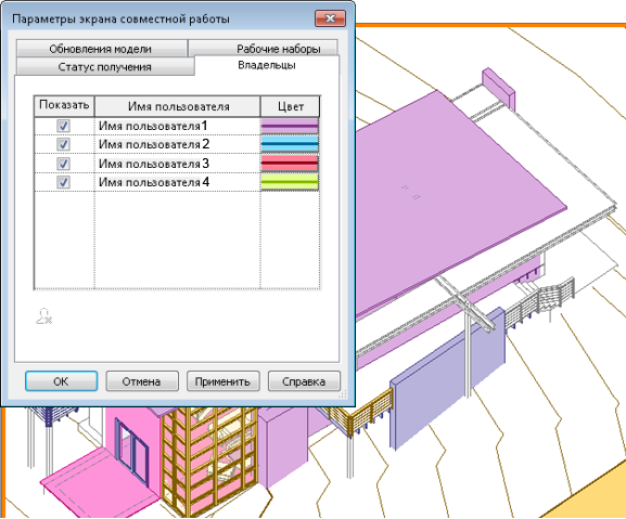 "Параметры экрана совместной работы". В модели отображается указанный цвет для соответствующего владельца.