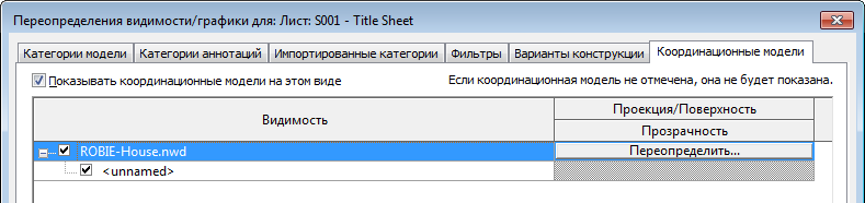 После связывания координационной модели в модели Revit используйте диалоговое окно «Видимость/Графика» для определения ее видимости и прозрачности. Параметр «Прозрачность» позволяет различать координационную модель и модель Revit.