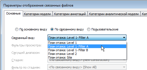 - В разделе "Связанный вид" выберите вид в связанной модели; заданные для этого вида параметры отображения будут применены к связанной модели на текущем главном виде.