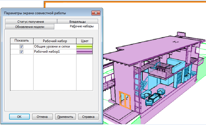 "Параметры экрана совместной работы". В модели отображается указанный цвет для соответствующего рабочего набора.