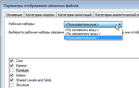Перейдите на вкладку "Рабочие наборы" диалогового окна "Параметры отображения связанных файлов" для главной модели. На этой вкладке можно выбрать конкретные рабочие наборы для отображения на виде главной модели.