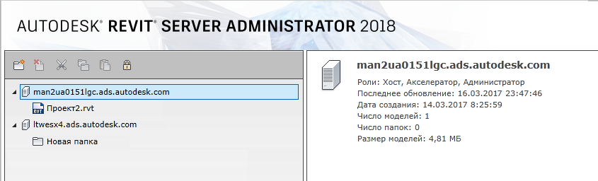 Используйте администратор Revit Server для управления папками и моделями из хранилища на хостах Revit Server, а также для блокирования моделей для выполнения административных действий.
