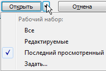Открывает заданные рабочие наборы. При нажатии кнопки «Открыть» откроется диалоговое окно «Открытие рабочих наборов». Первоначальное состояние зависит от того, когда в последний раз открывался файл. Укажите другие рабочие наборы или нажмите «ОК», чтобы подтвердить открытие рабочих наборов, предлагаемых по умолчанию. Клавиши Ctrl+A служат для выбора всех рабочих наборов в этом окне. |