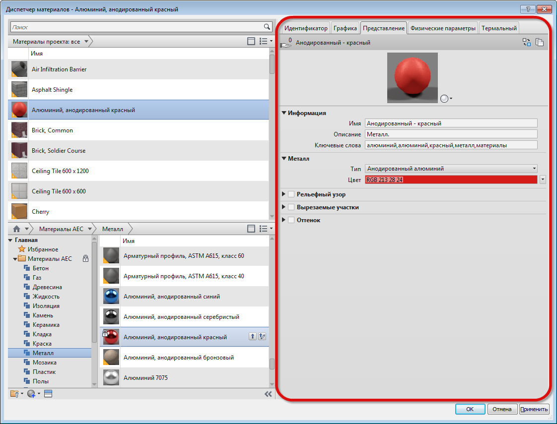 В Обозревателе материалов эти сведения отображаются на вкладках "Идентификация", "Графика" и "Внешний вид" панели "Редактор материалов".