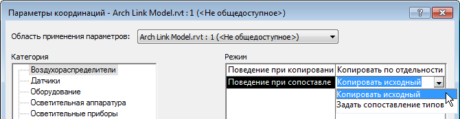 Перед копированием приборов из связанной модели в модель MEP или непосредственно в процессе копирования следует задать в диалоговом окне «Определение параметров координации» режим сопоставления для каждой категории приборов.
