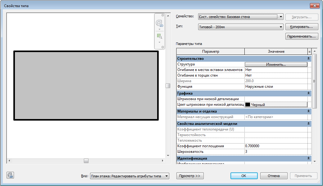 На иллюстрации ниже показано диалоговое окно "Свойства типа" для типоразмера стены с включенной областью предварительного просмотра.