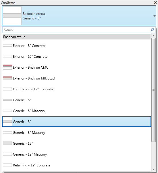 В списке «Выбор типа» отображается выбранный в данный момент типоразмер семейства, и кроме того, в нем можно выбрать другой типоразмер.