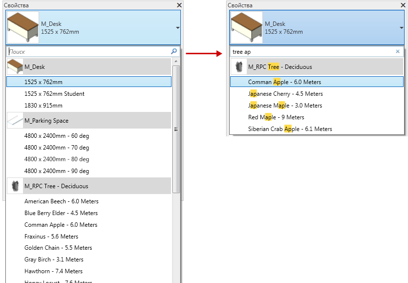 Revit для упрощения выбора из полного списка параметров. Поиск можно выполнять в следующих функциональных областях: