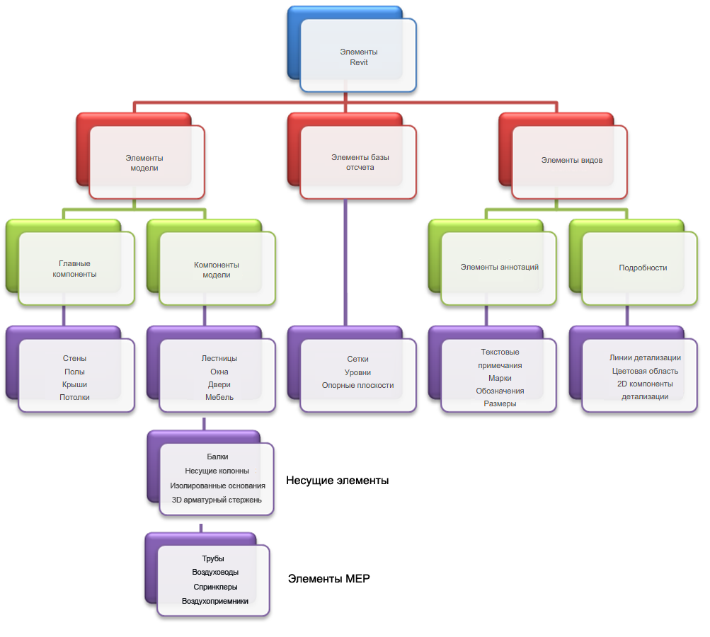 В Revit используются 3 типа элементов проектов: элементы модели, базовые элементы и элементы, относящиеся определенному виду. Элементы в Revit также относятся к семействам. Семейство содержит описание геометрии элемента и используемые для него параметры. Семейство определяет и контролирует каждый экземпляр элемента.