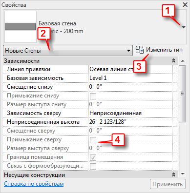 В большинстве случаев (за исключением тех, что упомянуты в следующем примечании) на палитре свойств отображаются и редактируемые пользователем свойства экземпляра, и те, которые доступны только для чтения (они затенены). Свойство может быть предназначено только для чтения из-за того, что его значение является расчетным, или назначается программой автоматически, или зависит от значения другого свойства. Например, для стены единственным редактируемым свойством будет «Неприсоединенная высота», если для ее свойства «Зависимость сверху» задано значение «Неприсоединенная». Определенные взаимосвязи рассматриваются в описаниях свойств экземпляров элементов конкретного типа.