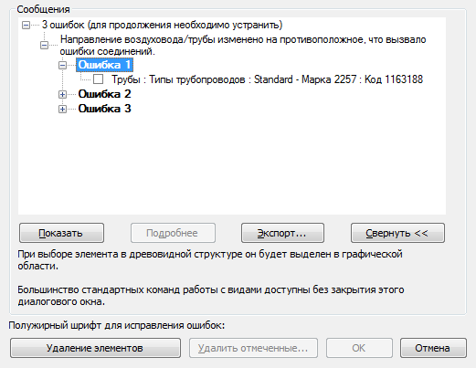 В диалоговом окне ошибки нажмите кнопку "Развернуть" для просмотра древовидной структуры с перечнем ошибок и предупреждений, связанных с последним действием.