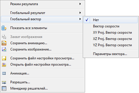5. При появлении графика щелкните правой кнопкой мыши около модели, разверните узел Глобальный вектори выберите Вектор скорости.
