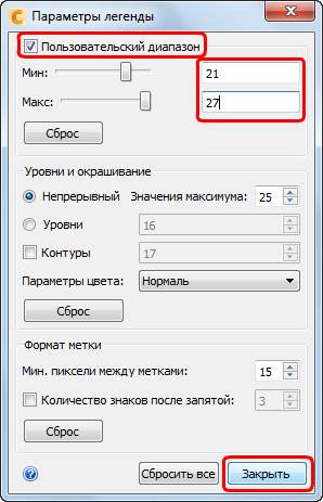 12. Выделите диапазон температур в этой области путем корректировки граничных значений легенды: