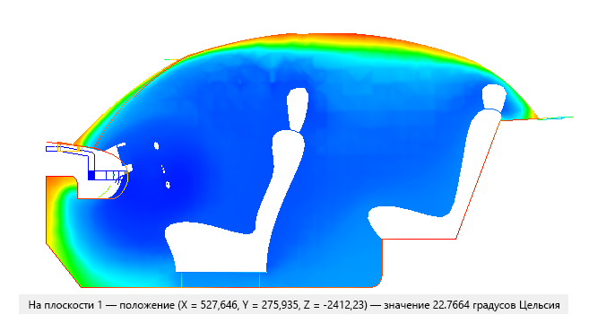 8. Перетащите стрелку триады нормали к плоскости, чтобы увидеть распределение температуры по всей кабине.