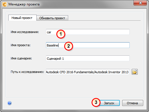 3. В Менеджере исследования проекта, назначьте имена проекту исследования, проекту и сценарию