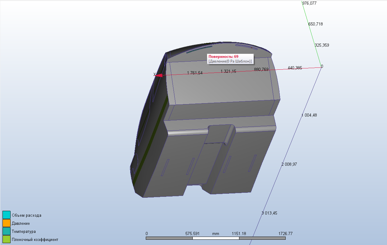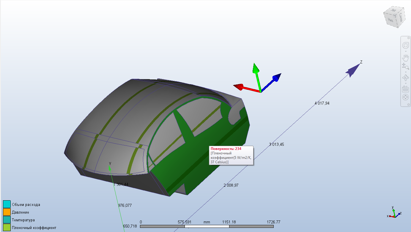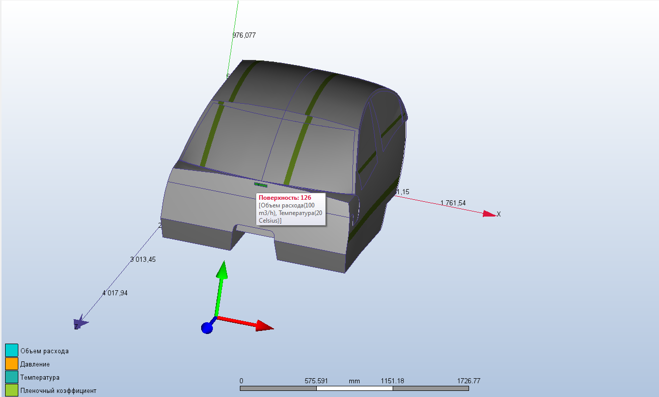 5. Холодный воздух проходит в кабину через прямоугольное отверстие ниже лобового стекла. Назначим температуру и расход для этой поверхности. Выберите поверхность и нажмите кнопку Редактировать на контекстной панели инструментов.