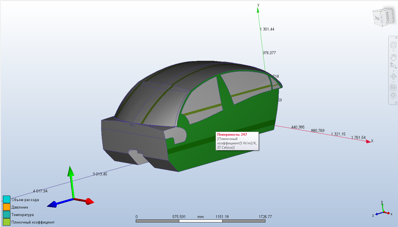13. Для симулирования стационарного транспортного средства в жарких условиях, необходимо учитывать коэффициент теплоотдачи по бокам и для верхней части пассажирской кабины. Выберите следующие поверхности, и нажмите кнопку Редактировать в контекстном меню: