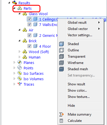 These commands provide the ability to change the displayed result on a part, change part appearance, assign parts as Summary Parts, and to calculate part-based results such as temperature using the Parts tool.