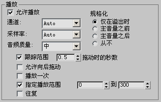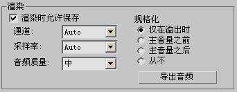 这些选项用于调整渲染音频的不同参数以便导出。除非导出音频并将其作为采样重新加载,否则在 3ds Max 中听不到这些音频参数的效果。此部分中的大部分选项的功能与“播放”组中相同选项的功能相同。此部分中的其他选项如下。