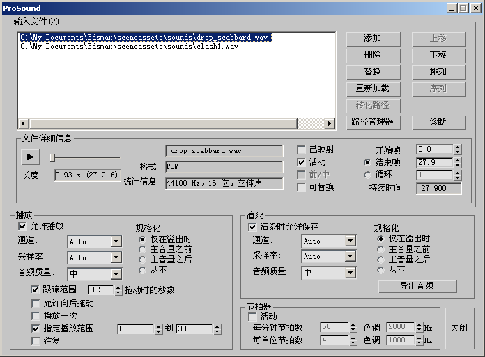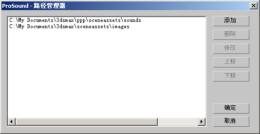 - 用来管理 ProSound 在查找采样时所搜索的磁盘位置。当加载在另一个系统(其中的采样可能位于不同目录下)中创建的 MAX 场景时,该功能十分有用。在“路径管理器”中添加目录可以为 ProSound 提供更多采样查找位置。例如,如果某个用户将场景与位于